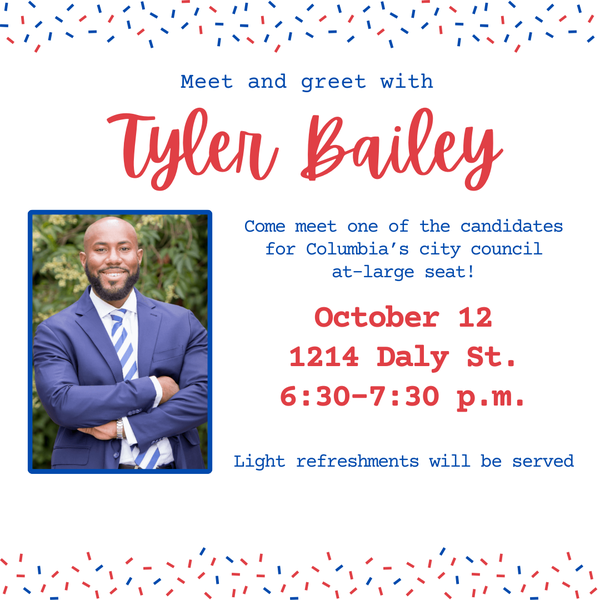 Columbia City Council at-large candidate Tyler Bailey speaks to meet and greet event attendees on Oct. 23, 2023.